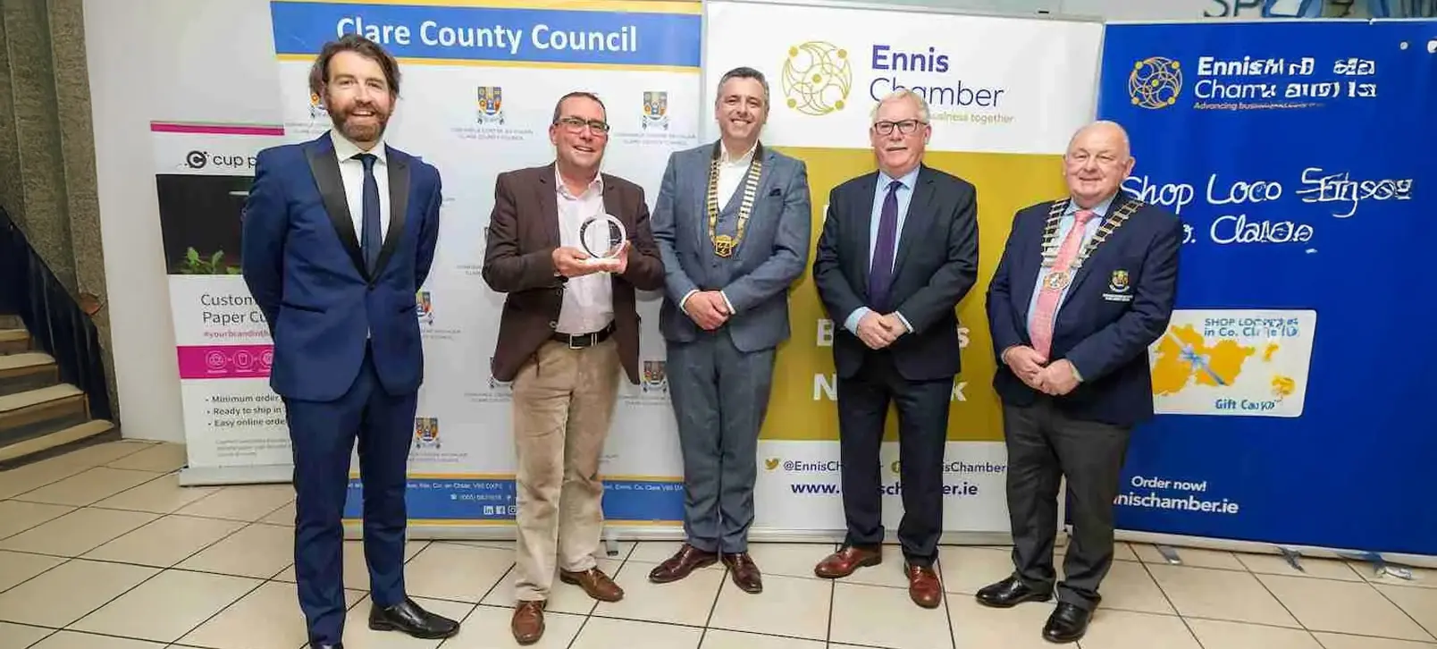 Pictured at the Awards Ceremony in Glor, Left to Right: Colm O’Regan , Author and Comedian and Awards MC, Peter Murphy, Ei, Darragh McAllister, President of Ennis Chamber, Gerry Murphy, Ei, PJ Ryan, Cathaoirleach Clare County Council.